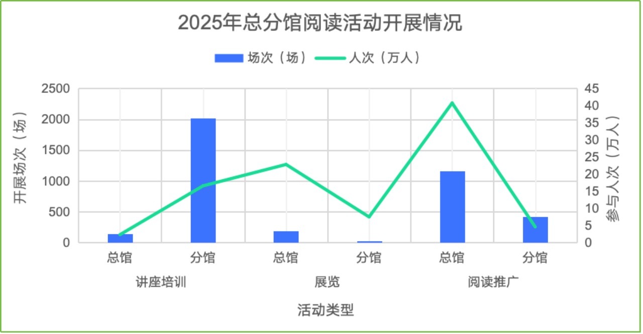 2025年荔湾区图书馆总馆累计举办活动场次1486场,累计吸引65.74万人参与;分馆累计举办活动2670场,累计吸引32.45万人参与。总馆主要举办活动类型为阅读推广,通过1157场形式丰富的阅读活动累计吸引40.73万人次参与;分馆主要活动类型为培训讲座,通过2022场主题丰富的阅读活动累计吸引20.16万人次参与。丰富多彩的活动吸引了不同人群参与,也反映出大众对阅读活动的热情与需求。