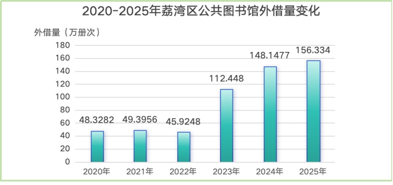 荔湾区2025年累计246.29万读者走进图书馆,156.34万册图书被借出,外借册次同比增长5.53%,全区人均借次达3.5册。另有数字阅读方面,数字资源浏览下载量达380.42万篇(册)次。