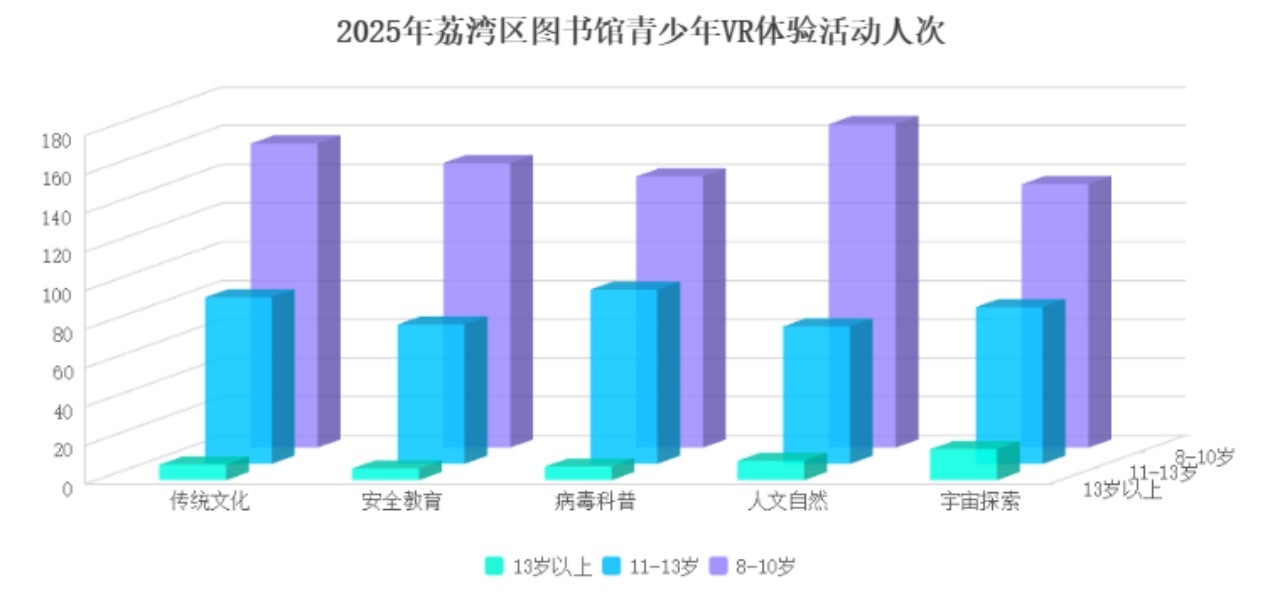 此外,荔湾区图书馆葵蓬馆全年提供VR阅读,其中8-10岁人群预约参与人数最多。2025年VR设备累计“出差”4次,累计1160人在图书馆外参与VR阅读新体验。